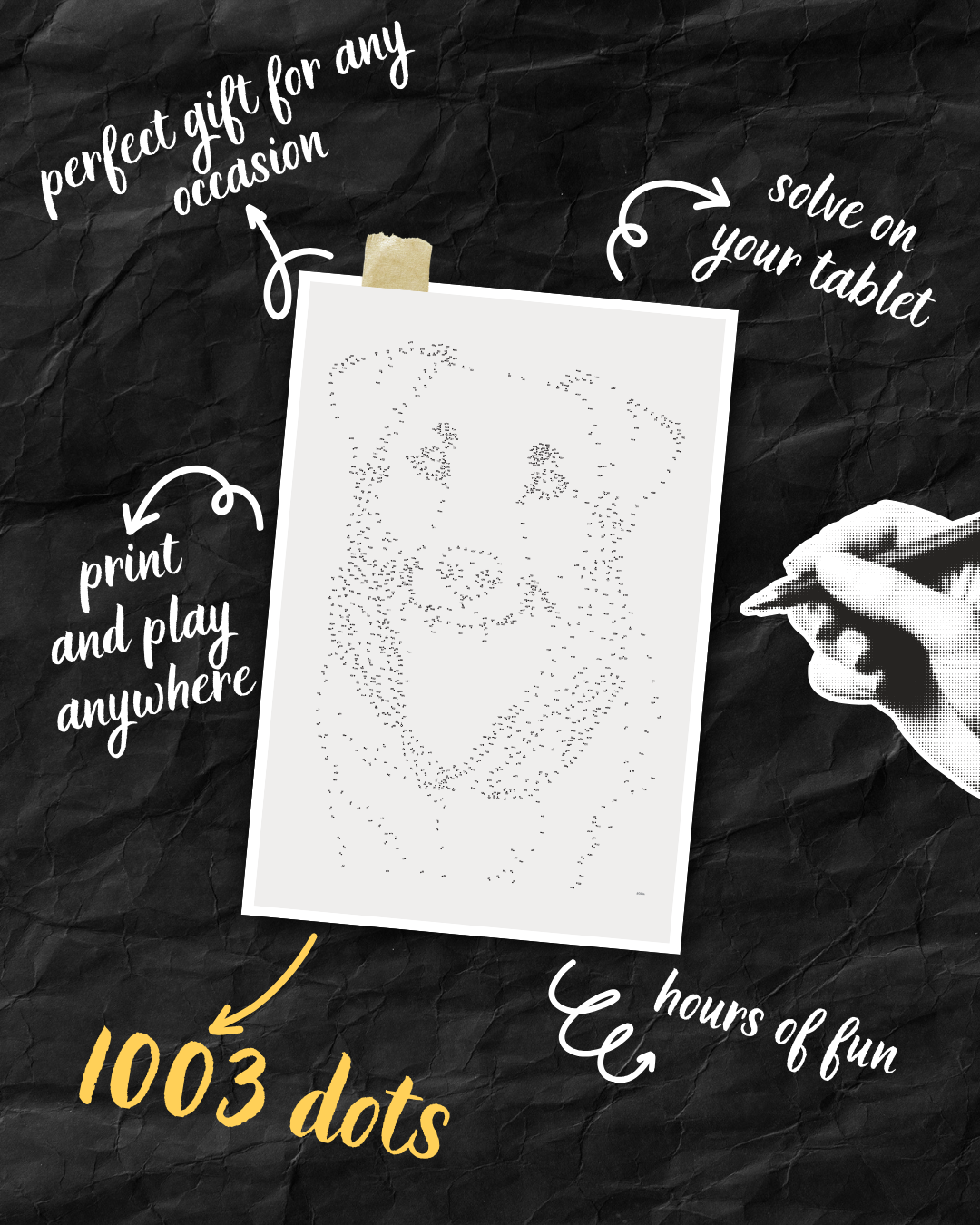 Chcesz podarować komuś (albo sobie!) wyjątkowy prezent? Zamów indywidualny projekt dot-to-dot ze zdjęciem ulubionego zwierzaka. Wystarczy, że wyślesz fotografię, a ja przygotuję dla Ciebie unikalny wzór. Trochę cierpliwości – i gotowe, możesz cieszyć się najbardziej osobistym dot-to-dot!